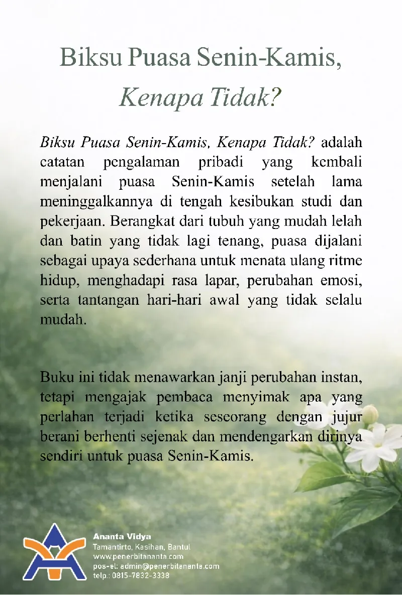 Buku ini tidak menawarkan janji perubahan instan, tetapi mengajak pembaca menyimak apa yang perlahan terjadi ketika seseorang dengan jujur berani berhenti sejenak dan mendengarkan dirinya sendiri untuk puasa Senin-Kamis.