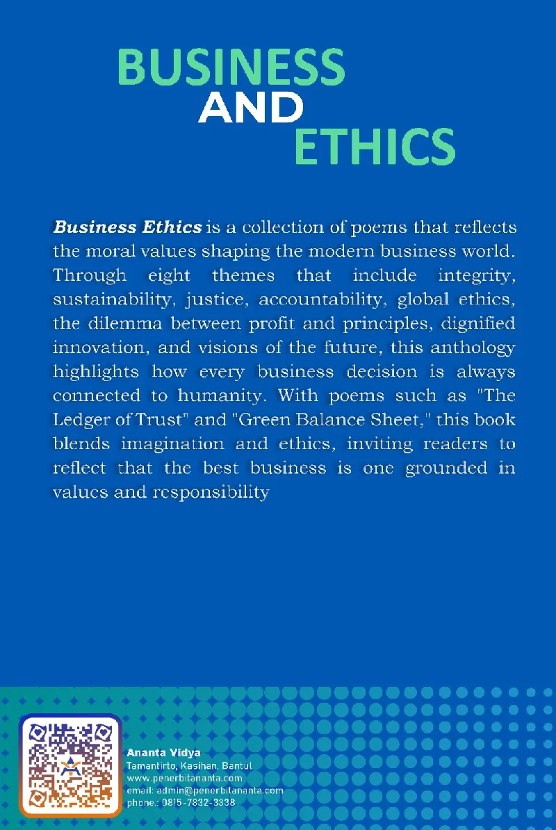 Business Ethics is a collection of poems that reflects the moral values shaping the modern business world. Through eight themes that include integrity, sustainability, justice, accountability, global ethics, the dilemma between profit and principles, dignified innovation, and visions of the future, this anthology highlights how every business decision is always connected to humanity. With poems such as "The Ledger of Trust" and "Green Balance Sheet," this book blends imagination and ethics, inviting readers to reflect that the best business is one grounded in values and responsibility