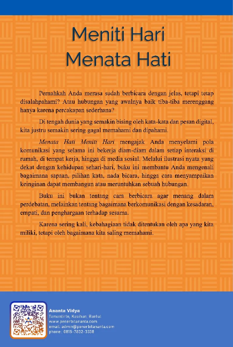 Menata Hati Meniti Hari mengajak Anda menyelami pola komunikasi yang selama ini bekerja diam-diam dalam setiap interaksi di rumah, di tempat kerja, hingga di media sosial. Melalui ilustrasi nyata yang dekat dengan kehidupan sehari-hari, buku ini membantu Anda mengenali bagaimana sapaan, pilihan kata, nada bicara, hingga cara menyampaikan keinginan dapat membangun atau meruntuhkan sebuah hubungan.