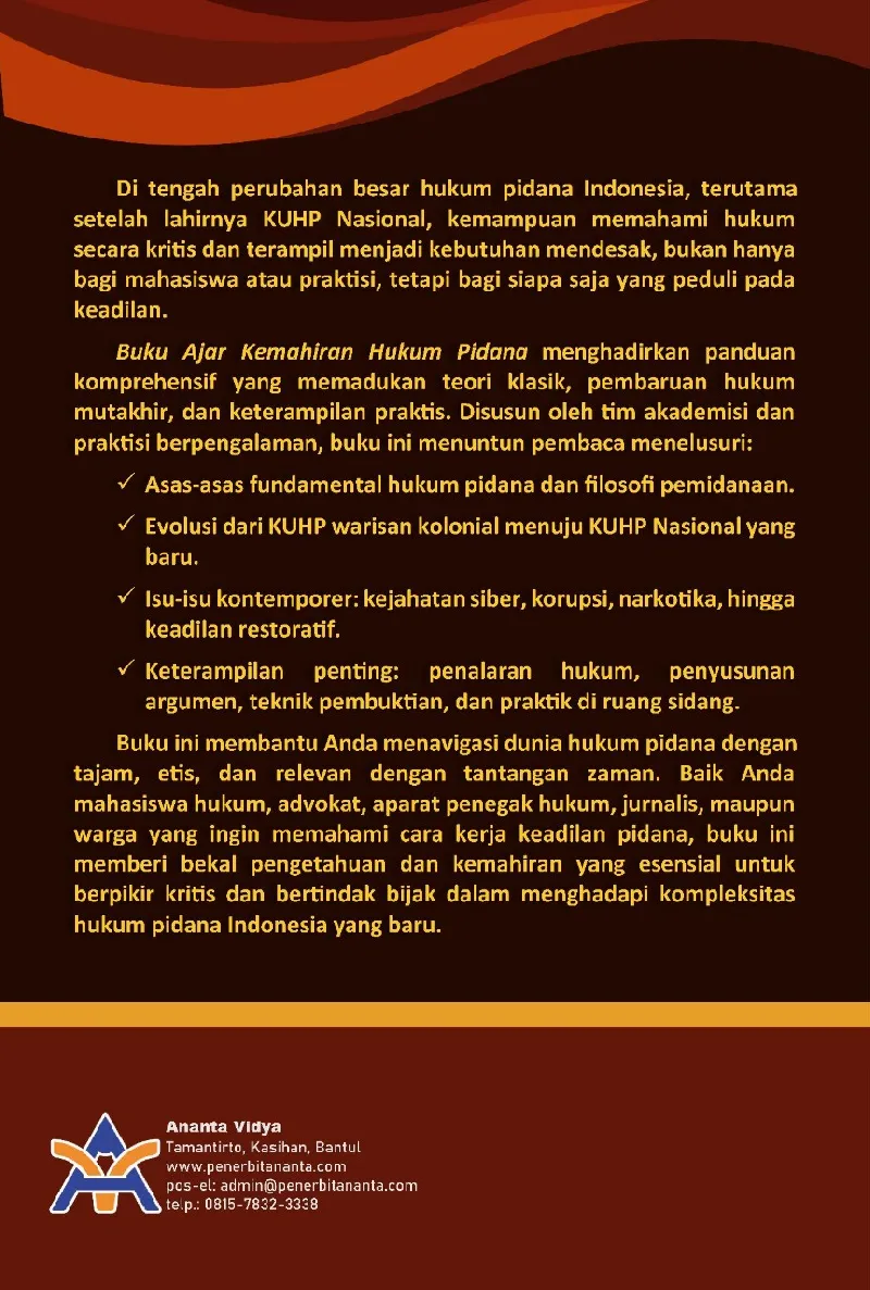 Buku Ajar Kemahiran Hukum Pidana menghadirkan panduan komprehensif yang memadukan teori klasik, pembaruan hukum mutakhir, dan keterampilan praktis. Disusun oleh tim akademisi dan praktisi berpengalaman, buku ini menuntun pembaca menelusuri: