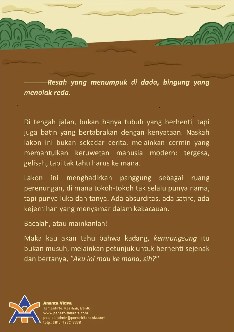 Di tengah jalan, bukan hanya tubuh yang berhenti, tapi juga batin yang bertabrakan dengan kenyataan. Naskah lakon ini bukan sekadar cerita, melainkan cermin yang memantulkan keruwetan manusia modern: tergesa, gelisah, tapi tak tahu harus ke mana.