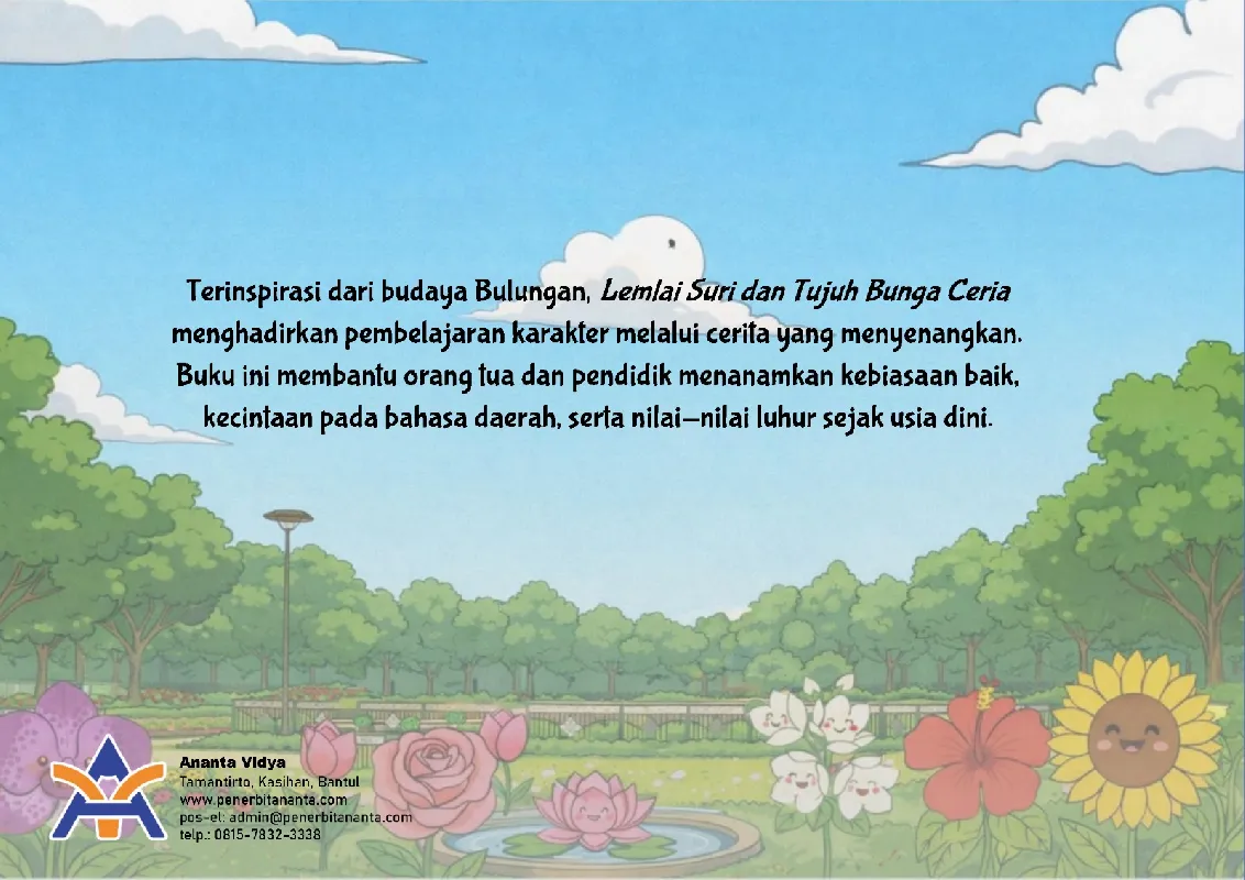 Buku ini membantu orang tua dan pendidik menanamkan kebiasaan baik, kecintaan pada bahasa daerah, serta nilai-nilai luhur sejak usia dini.
