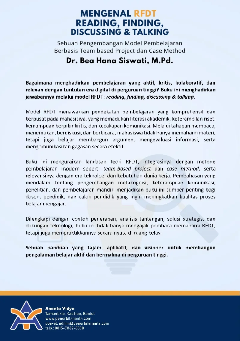 Buku ini menguraikan landasan teori RFDT, integrasinya dengan metode pembelajaran modern seperti team-based project dan case method, serta relevansinya dengan era teknologi dan kebutuhan dunia kerja. Pembahasan yang mendalam tentang pengembangan metakognisi, keterampilan komunikasi, penelitian, dan pembelajaran mandiri menjadikan buku ini sumber penting bagi dosen, pendidik, dan calon pendidik yang ingin meningkatkan kualitas proses belajar mengajar.