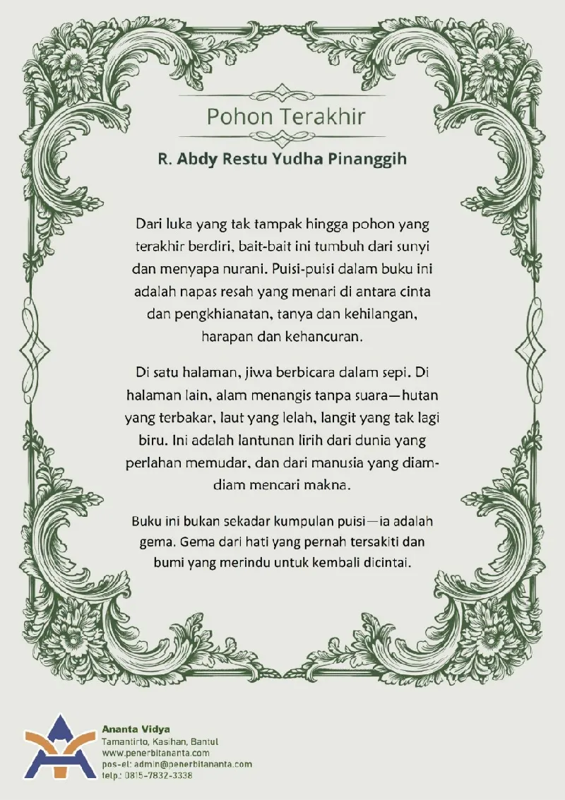 Dari luka yang tak tampak hingga pohon yang terakhir berdiri, bait-bait ini tumbuh dari sunyi dan menyapa nurani. Puisi-puisi dalam buku ini adalah napas resah yang menari di antara cinta dan pengkhianatan, tanya dan kehilangan, harapan dan kehancuran.