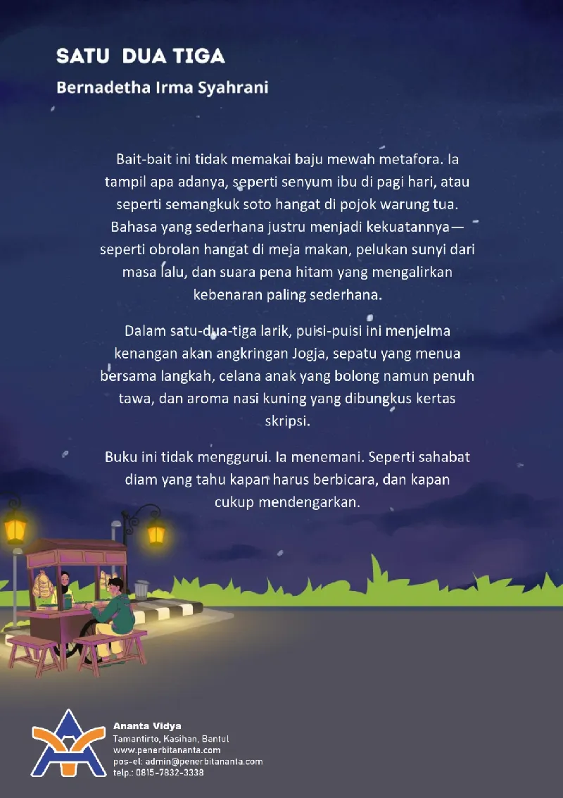 Dalam satu-dua-tiga larik, puisi-puisi ini menjelma kenangan akan angkringan Jogja, sepatu yang menua bersama langkah, celana anak yang bolong namun penuh tawa, dan aroma nasi kuning yang dibungkus kertas skripsi.
