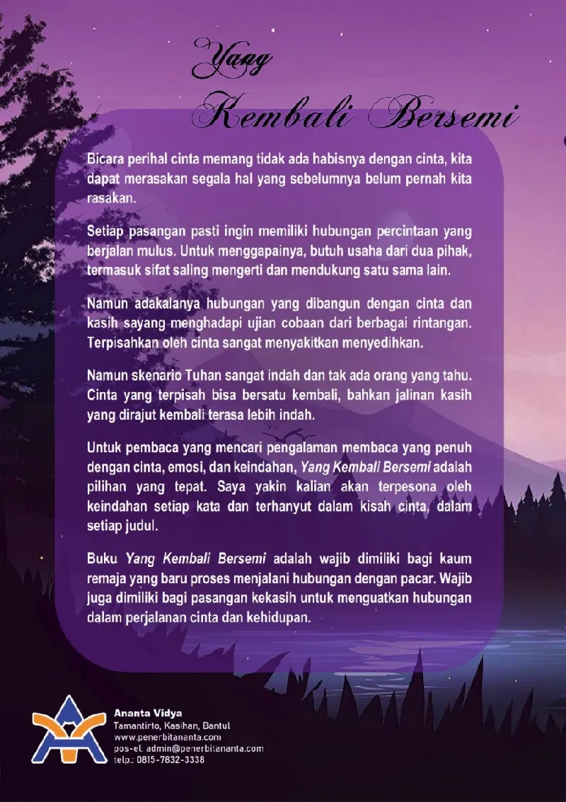 Buku Yang Kembali Bersemi adalah wajib dimiliki bagi kaum remaja yang baru proses menjalani hubungan dengan pacar. Wajib juga dimiliki bagi pasangan kekasih untuk menguatkan hubungan dalam perjalanan cinta dan kehidupan.